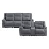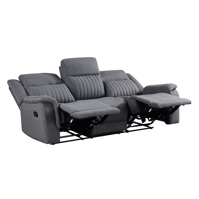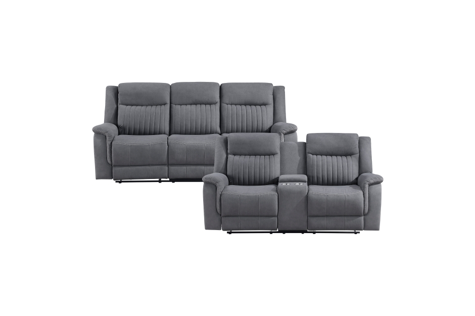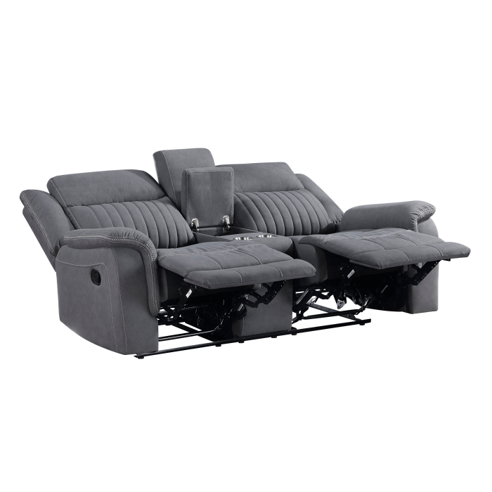 Convenience and comfort provide the basis of the design of the Dean Collection while the unfettered lines of modern design lend a casual air to the seating group’s profile. The sofa and love seat feature dual reclining ends with the love seat featuring a console with cup holders and hidden storage space while the reclining chair allows for solo seating within your space. Manual motion mechanisms allow for your reclined experience and are engaged with a pull of the side mounted tab. Gray polished microfiber presents as a neutral palette for your home’s subtle modern style.