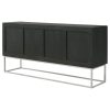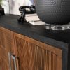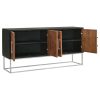 Asian inspiration creates the decadence you seek in outfitting a dining room or living space. This accent cabinet reflects a level of minimalism dressed up with gorgeous finishes to create an exotic ambiance with plenty of function. Rich walnut finish mango wood front panels and a black case offer a mix of smooth and textured effects, as a bracket-style iron frame and matching door hardware create a compelling palette. Find space on two fixed interior shelves behind each set of doors to store dishes, serve ware, or anything that needs to be tucked away. Smooth drawer closure is possible thanks to magnetic closures.