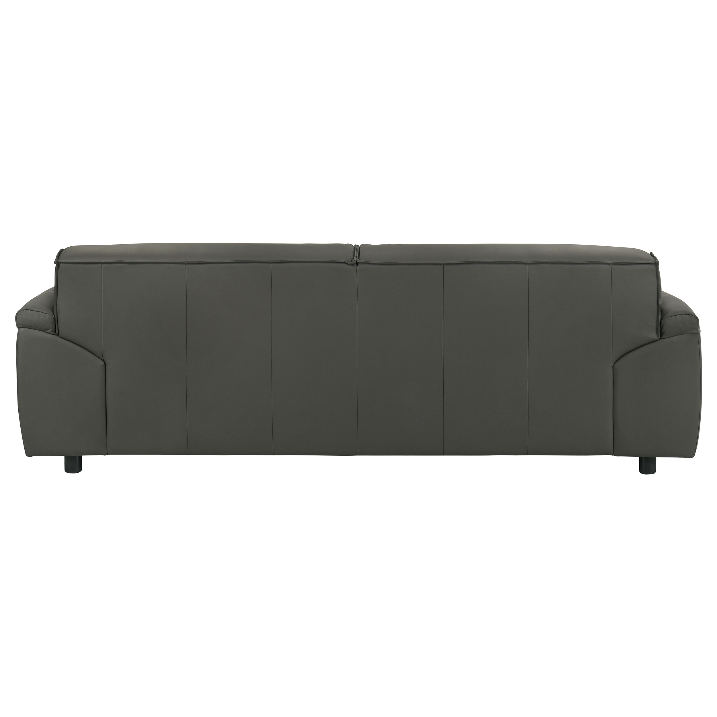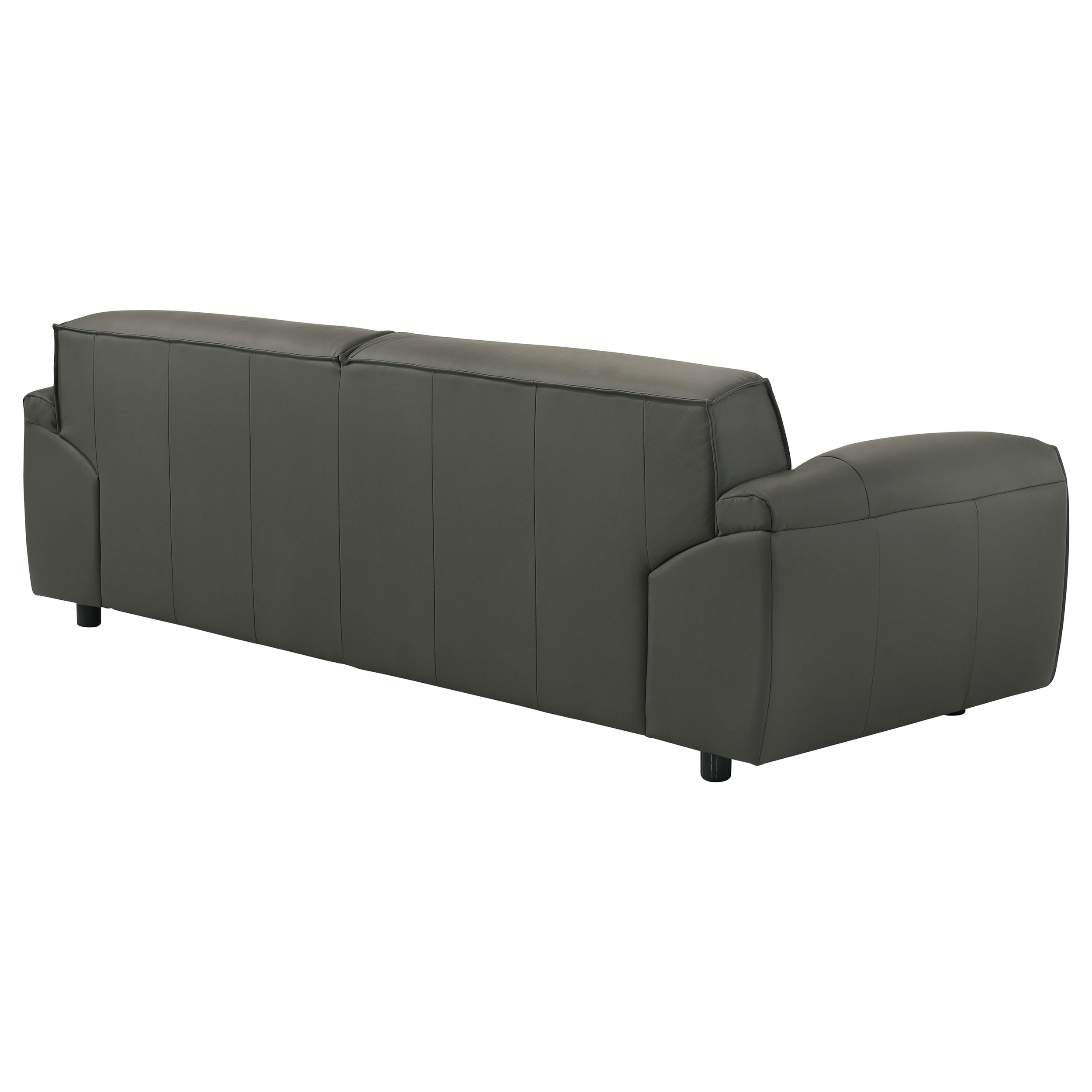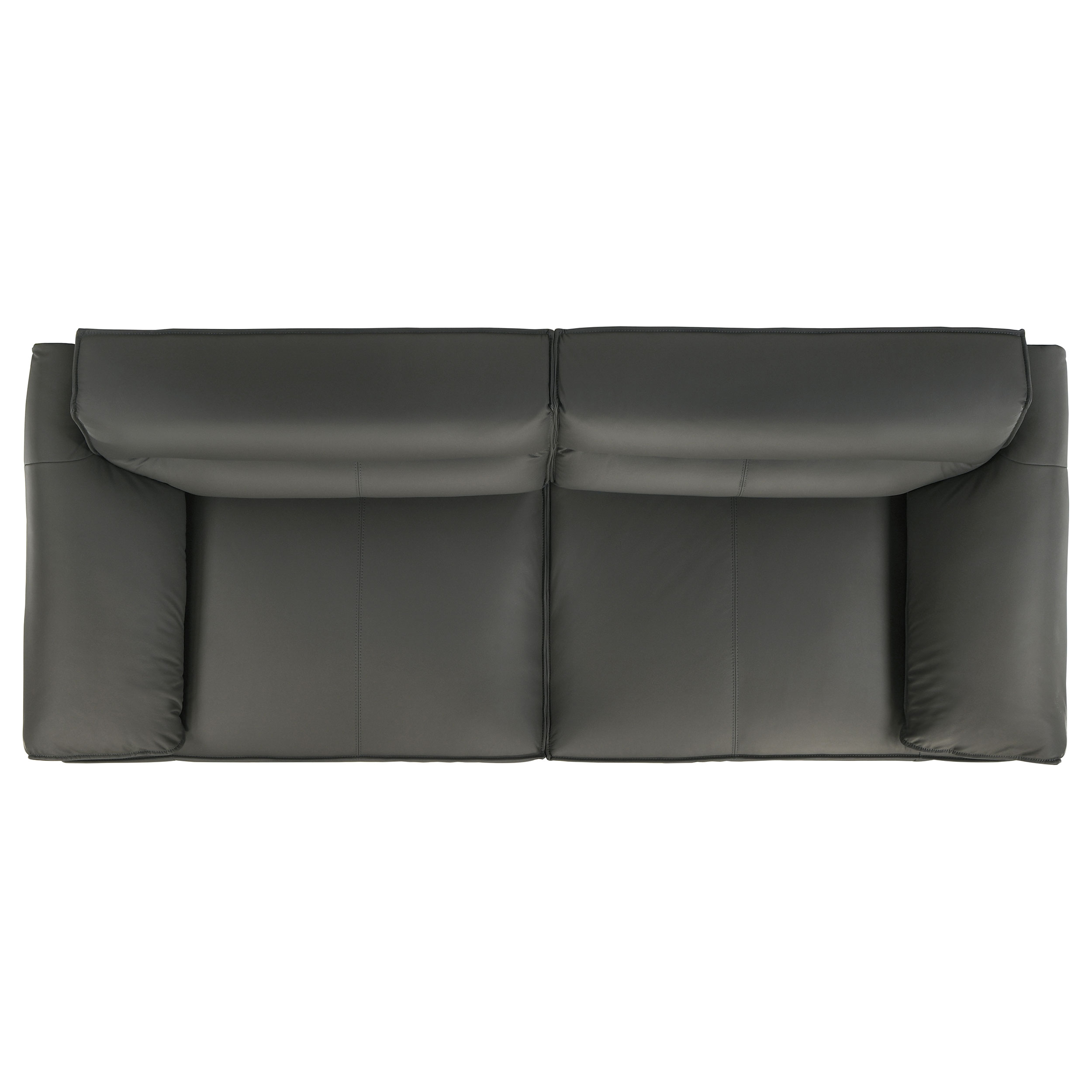 Sleek and sculptural, this leather-upholstered sofa blends minimalist form with elevated comfort. Wrapped in 100% genuine top grain leather, it offers a luxurious hand and timeless presence. Wide track arms and a low-profile frame shape a bold, architectural silhouette, while deep seating and padded back cushions provide an inviting place to unwind. Built with sinuous spring support and high-density full foam seating, it delivers lasting comfort wrapped in tailored sophistication.