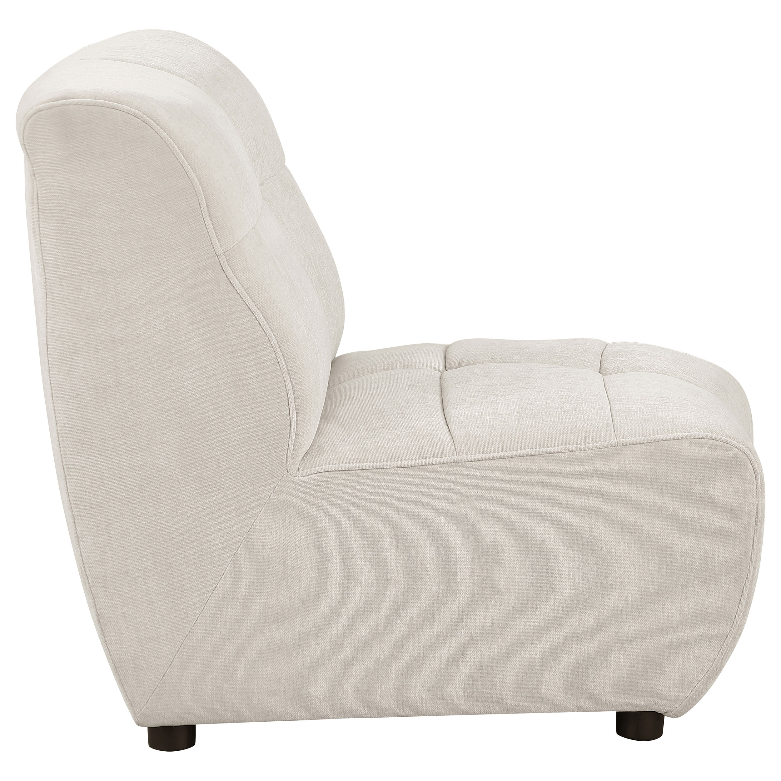 Elevate your living space with this armless chair. Its sleek, minimalist silhouette offers a sanctuary of comfort, the soft ivory fabric whispering luxury and adaptability to any room’s palette. The chair’s subtle curves welcome relaxation, while the plump, foam-filled cushions and delicate tufting detail infuse a touch of elegance. Perfect alone for a cozy reading nook or as part of a grander arrangement, this armless chair promises to be the cornerstone of a stylish, inviting retreat that’s as suited for quiet contemplation as it is for lively gatherings.