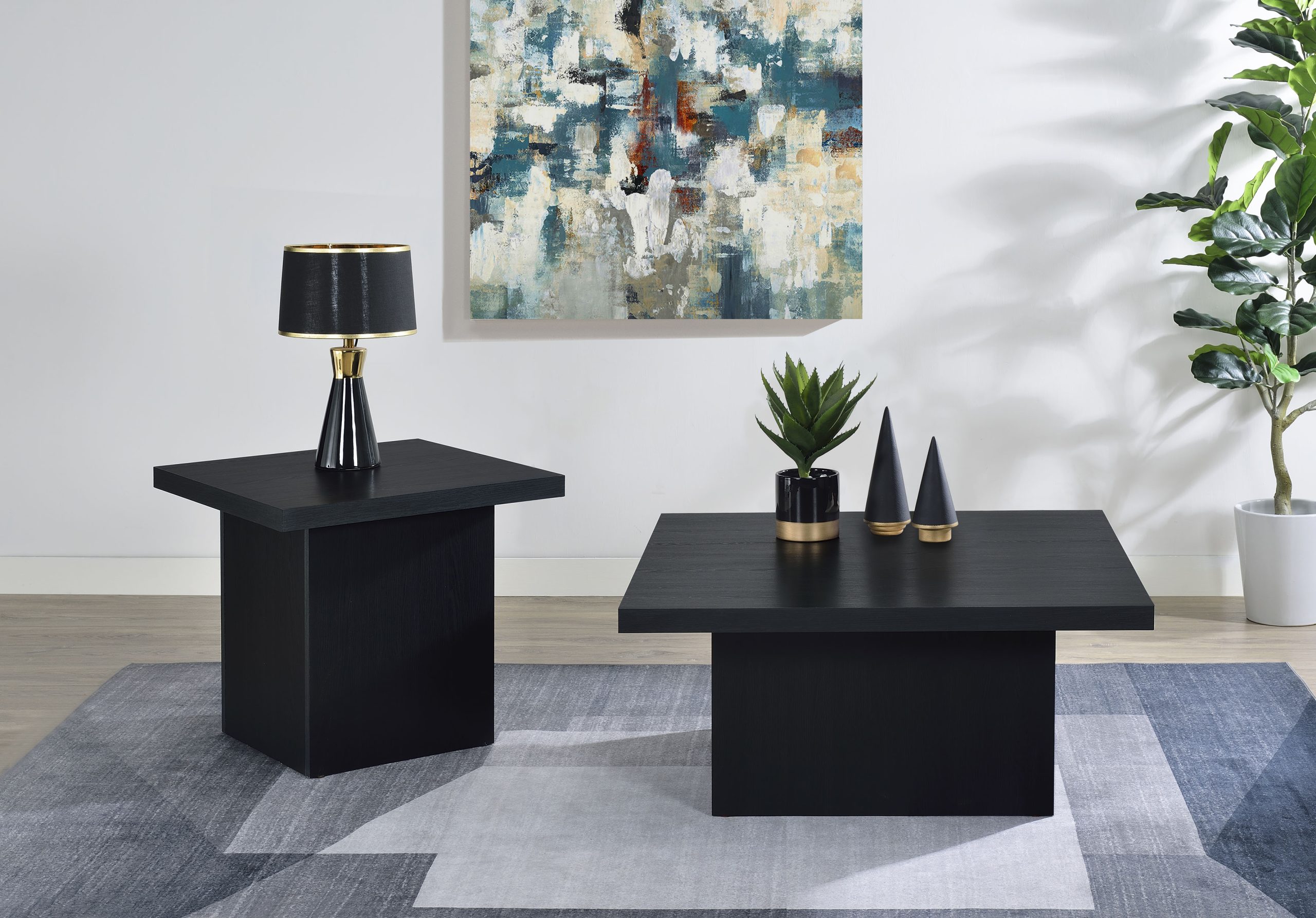 A striking coffee table built for bold presence and practical appeal. Its thick square silhouette emphasizes clean lines and sculptural symmetry, while the black finish evokes modern elegance. Crafted from engineered wood with a realistic wood grain laminate veneer, the surface offers durability and organic texture. Ideal for grounding any living room, this cocktail table brings weight and refinement to contemporary spaces.