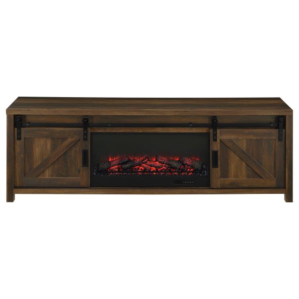 * Fireplace TV stand in dark pine finish with black metal accents and sliding barn-style doors