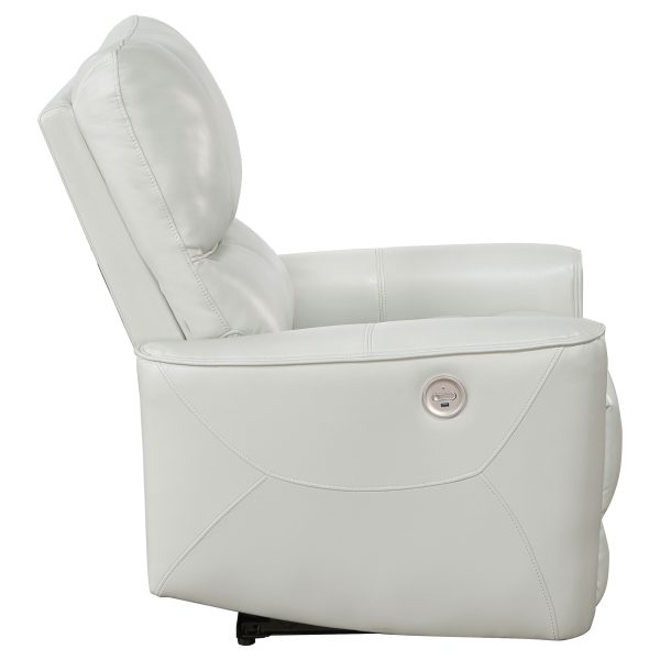 Contemporary elegance plays out in a clean, modern design as the power recliner delivers beauty and comfort to a space reserved for easy entertaining and relaxing. Dove grey leatherette upholstery covers wood framing to provide a sturdy build, embellished with plump foam fill in a tall, attached back cushion and supportive seat cushion. Subtle tufting cradles body positioning, aided in luxurious comfort by power reclining at the touch of a button on a switch panel with a handy USB port. The versatility of a clean dove grey finish joins a delightfully simple yet elegant style motif to make this power recliner a hit in any modern space. This power recliner is all that’s needed for a relaxing day or evening.