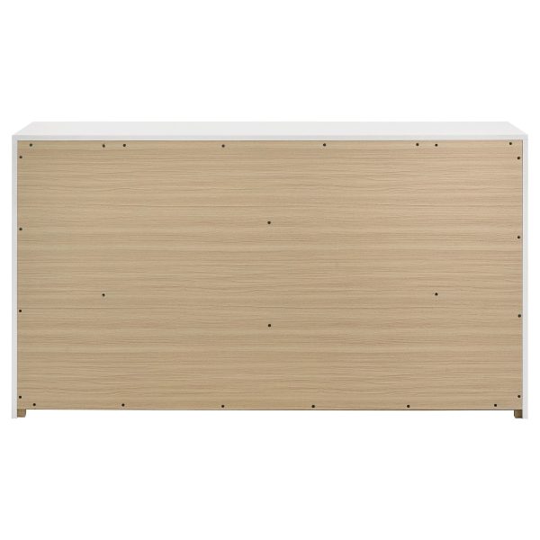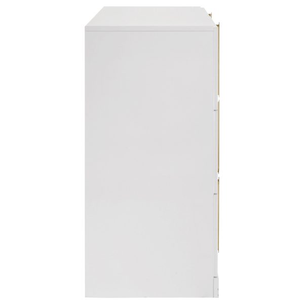 Clean and structured, this six-drawer dresser draws from Italian contemporary style to deliver bold presence and refined function. Finished in white high gloss PET thermoplastic, it offers a scratch-resistant, moisture-resistant surface that is both durable and eco-friendly. Vertically mounted polished gold pulls create a sculptural centerline across six smooth-gliding drawers, combining sleek storage with standout design.