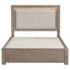 * Headboard features an upholstered panel with foam cushioning and neutral beige fabric