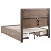 * Four bed drawers add easy storage to a modern four-piece bedroom set with an upholstered headboard