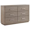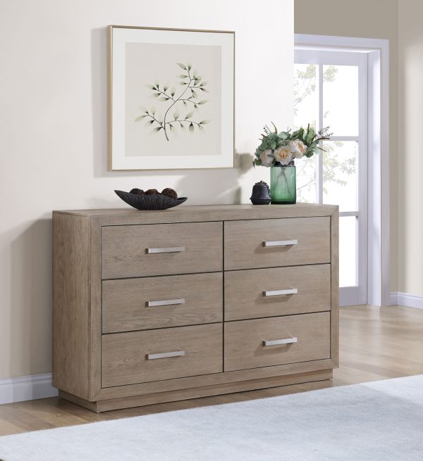 Prioritize chic storage with this four-piece modern bedroom set that includes built-in LED lighting in both the headboard and one-drawer nightstand. A light barley brown wood grain finish pairs with beige upholstery, creating a neutral color palette to enhance your linens and surrounding decor. The set centers on a platform-style bed with four underbed drawers for easy storage and an LED headboard with an upholstered panel that adds cozy foam cushioning for comfortable lounging. The nightstand is a C-shaped design with one drawer, a large shelf space and LED lighting that adds soothing ambiance to your bedroom setting. The dresser and framed mirror combo completes the look, offering six drawers with chrome finish bar pulls that complement perfectly.
