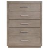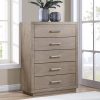 Chrome finish bar pulls add a touch of shine to the neutral barley brown finish of a modern five-drawer chest. Delivering ample storage with a compact footprint, the chest features a streamlined silhouette with mitered trim that creates a sense of depth. The top provides an easy spot for decor or a jewelry box that brings a personal touch. The soft wood grain finish of the chest complements in a variety of bedroom settings, making this a versatile choice for your home. The look is complete with a recessed base that provides a touch of height and airy presence.