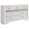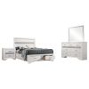 Create a stunning bedroom ensemble that’s fit for modern royalty. Each gorgeous piece in this four-piece set flaunts silvery, sparkling accents for a truly glamorous look. The bed features a solid, straight silhouette and two storage drawers built into the base. The case pieces bring you even more storage space to keep your room looking neat and tidy. Available in a variety of colors and sizes, there’s an option to bring any bedroom to life.