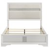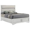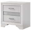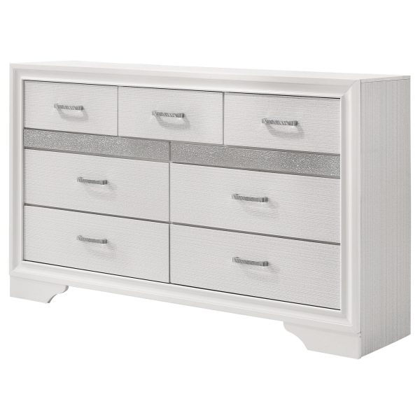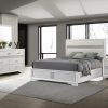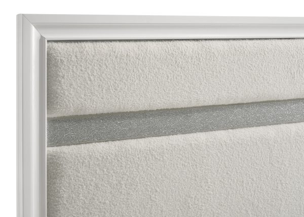 Encourage a glam vibe in your refined bedroom with a modern four-piece bedroom set. Centering on a stylish bed with an upholstered headboard and low footboard, the set includes a two-drawer nightstand for easy bedside storage and display space. A seven drawer dresser and mirror complete the set, adding diamond-like trim across its face that catches the light and offers a sophisticated touch. Bracket feet add a touch of dimensionality and movement to each piece and jewel-like bar pulls add intriguing sparkle. A cool white finish is textured, while white finish trim is smooth, creating a touch of textural contrast that add engaging style.