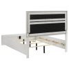 * Bedroom set with upholstered panel bed featuring glitter-accented headboard stripe