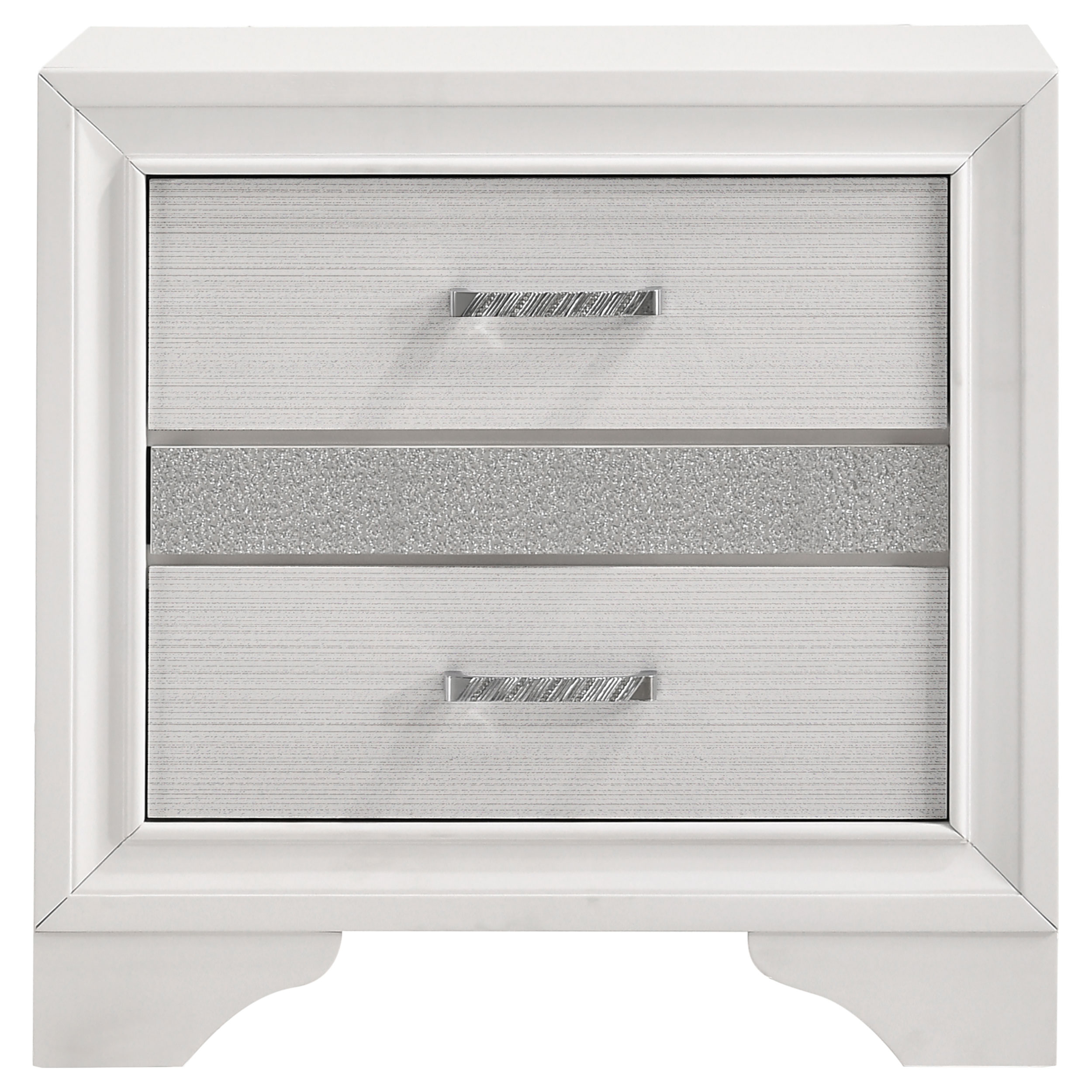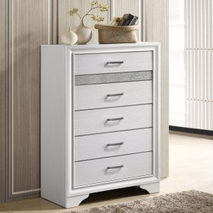 Create a stunning bedroom ensemble that’s fit for modern royalty. Each gorgeous piece in this four-piece set flaunts silvery, sparkling accents for a truly glamorous look. The bed features a solid, straight silhouette and two storage drawers built into the base. The case pieces bring you even more storage space to keep your room looking neat and tidy. Available in a variety of colors and sizes, there’s an option to bring any bedroom to life.
