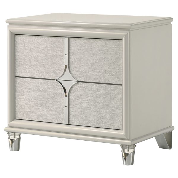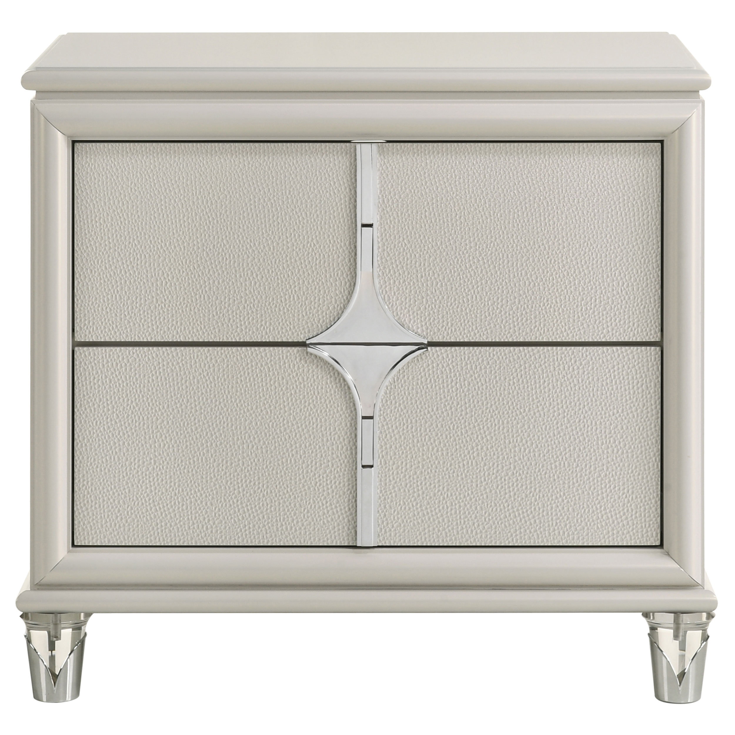 Elevate your nighttime routine with this stylish 2-drawer nightstand, a perfect blend of form and function. The pearl white finish and diamond star design on the drawer front offer a touch of glamour, while the chrome metal pulls add a sleek contrast. Featuring a top drawer with cord management access, this nightstand is designed to keep your devices neatly organized. The acrylic legs and chrome tulip-shaped caps provide a unique and elegant touch. Experience convenience and style right by your bedside.