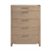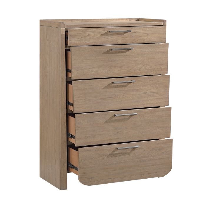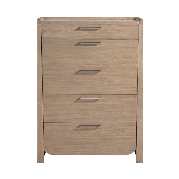 Add stylish and efficient storage to your bedroom with this contemporary 5-drawer chest, featuring a chic light brown finish that enhances any modern decor. Crafted from a durable blend of hickory veneer, wood, and engineered wood, this chest is built for lasting quality and aesthetic appeal. It offers five spacious dovetail drawers that glide effortlessly on smooth ball-bearing glides, providing ample vertical storage for clothing, linens, and accessories. Each drawer is accented with sleek antique nickel-tone bar pulls, adding a touch of refined sophistication. This fully assembled piece is designed to be a functional and elegant addition to your sleep space, optimizing organization without compromising on style.