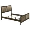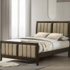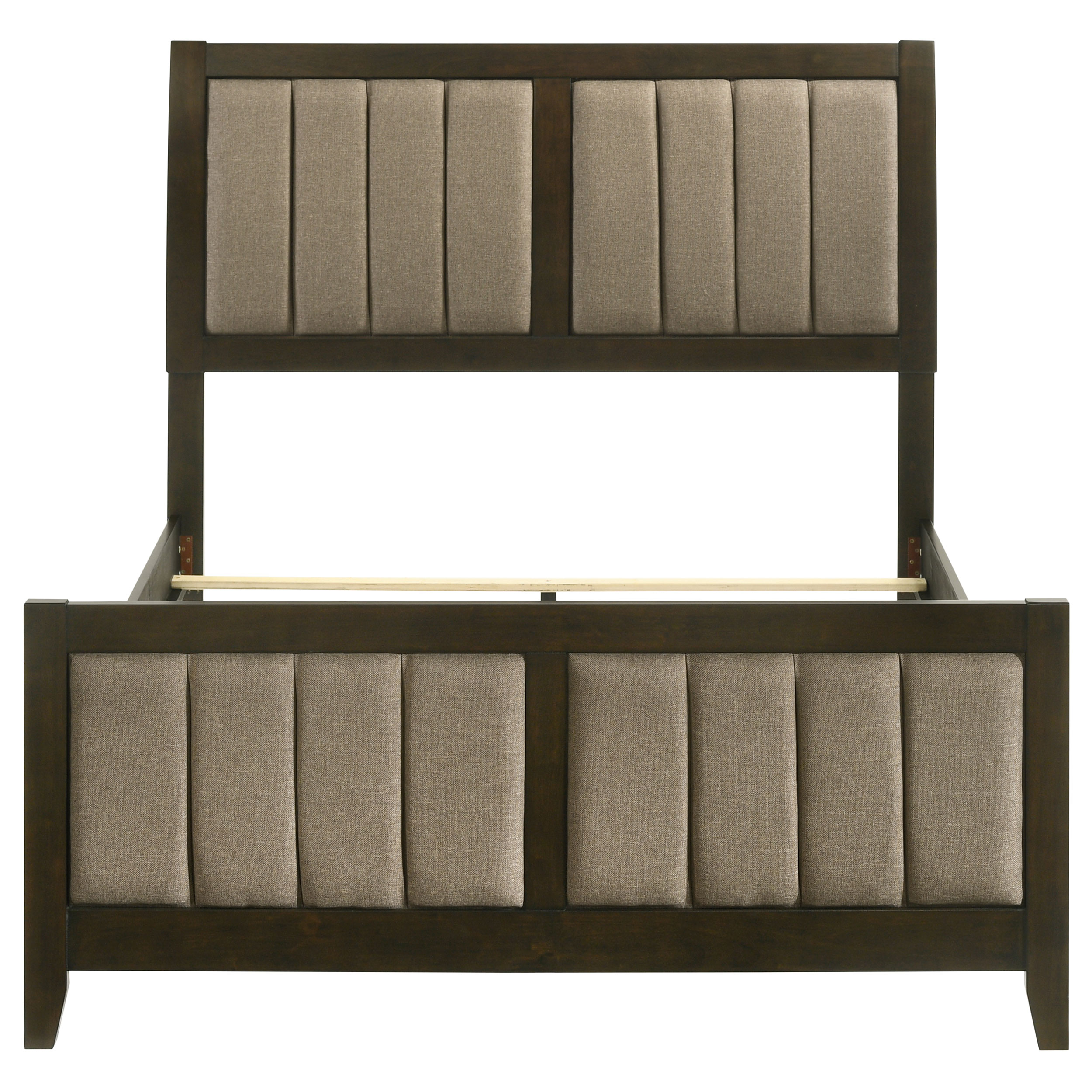 This panel bed adds a luxurious touch to your bedroom with its bold vertical channel tufting on the padded headboard and footboard. The dark cocoa finish complements the soft brown fabric upholstery, creating a warm, inviting aesthetic. The clean lines and vertical detailing provide a sleek, contemporary look while maintaining an air of sophistication. Crafted from high-quality materials, this bed offers both durability and style, making it the perfect centerpiece for your bedroom. Its sturdy design ensures comfort and long-lasting appeal.