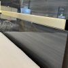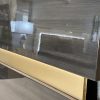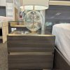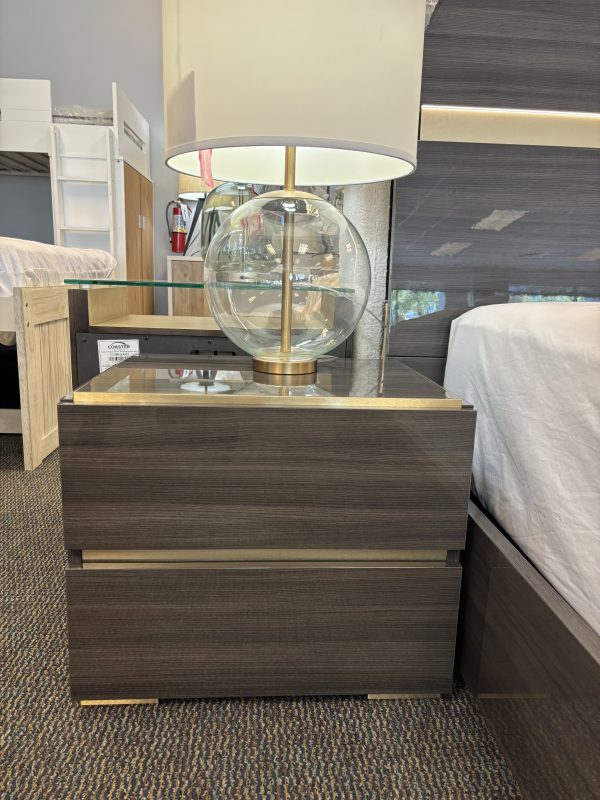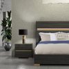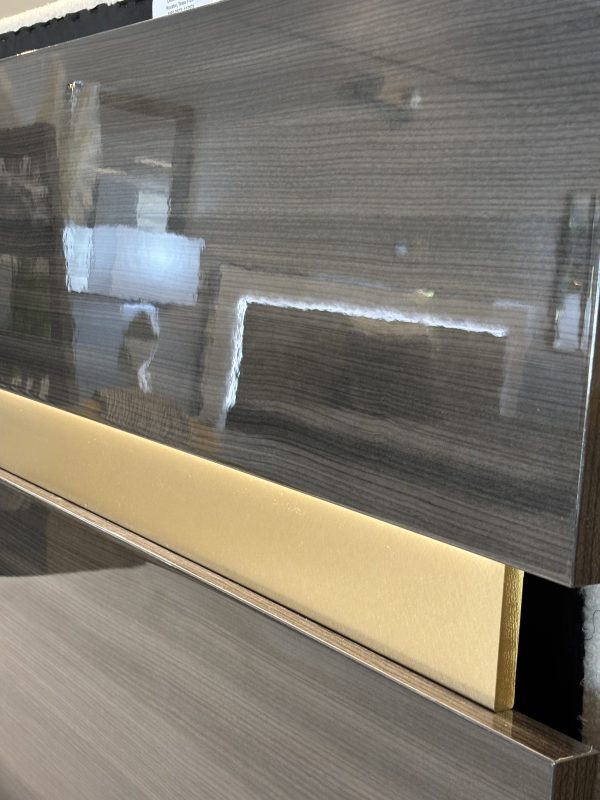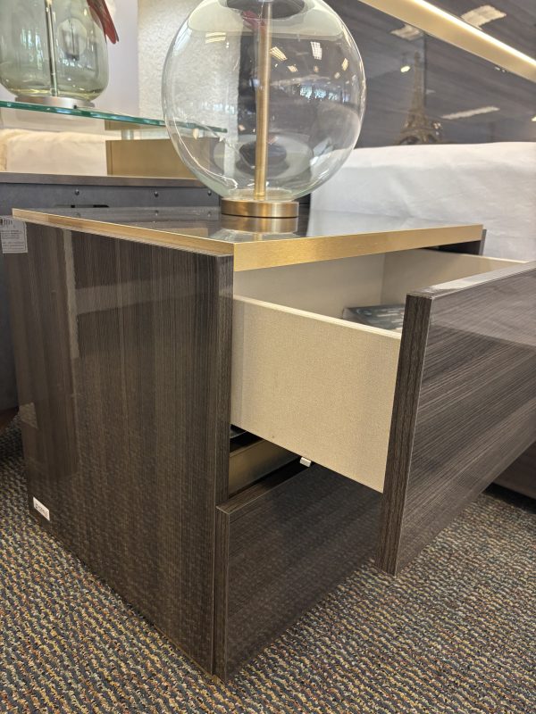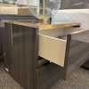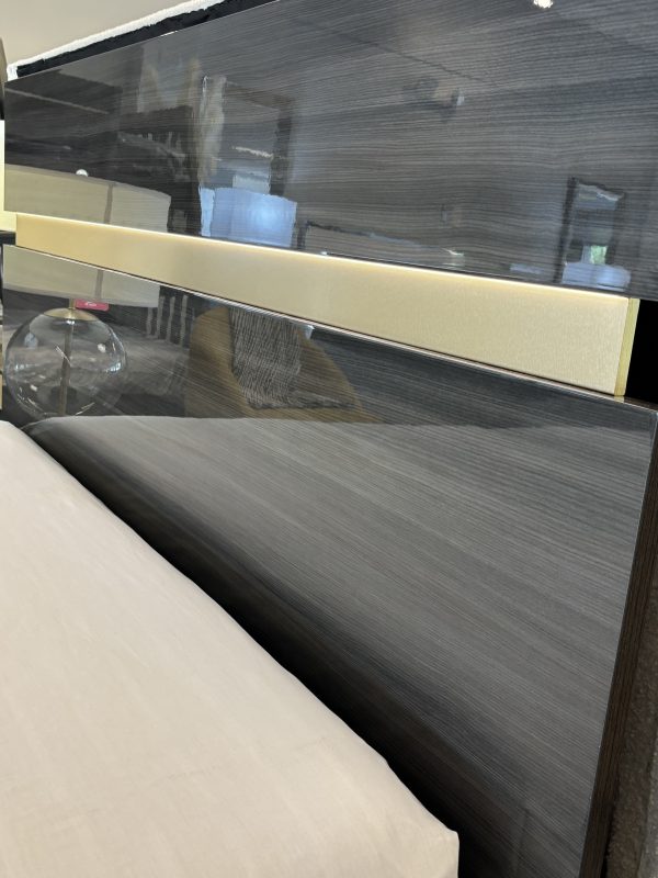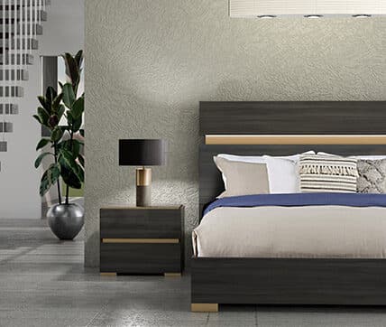 The Yvette Collection blends deep gray wood grain with gold metallic accents, creating a sleek and modern look. The platform bed features a horizontal gold band illuminated by integrated LED lighting for added elegance.