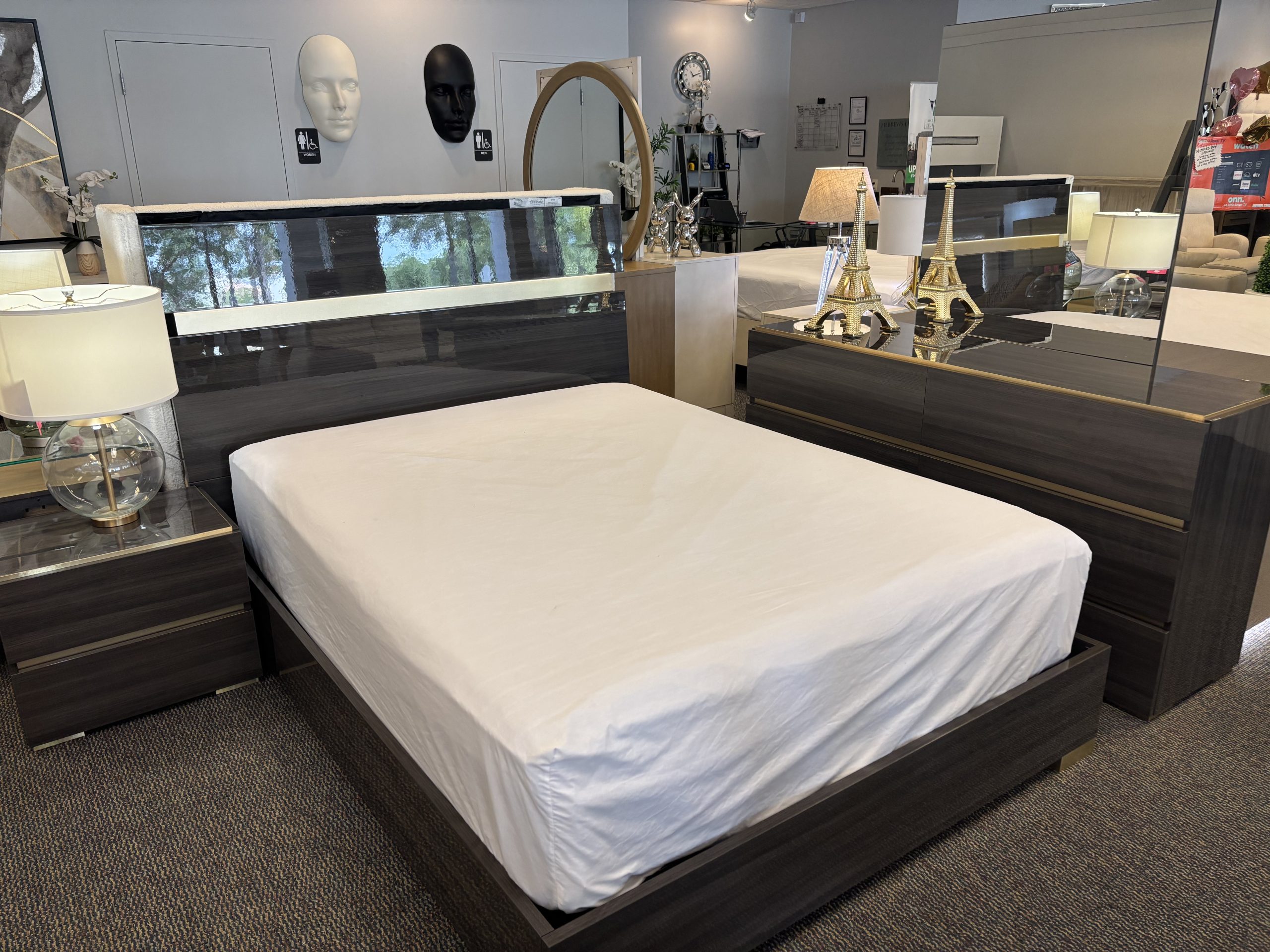 The Yvette Collection blends deep gray wood grain with gold metallic accents, creating a sleek and modern look. The platform bed features a horizontal gold band illuminated by integrated LED lighting for added elegance.